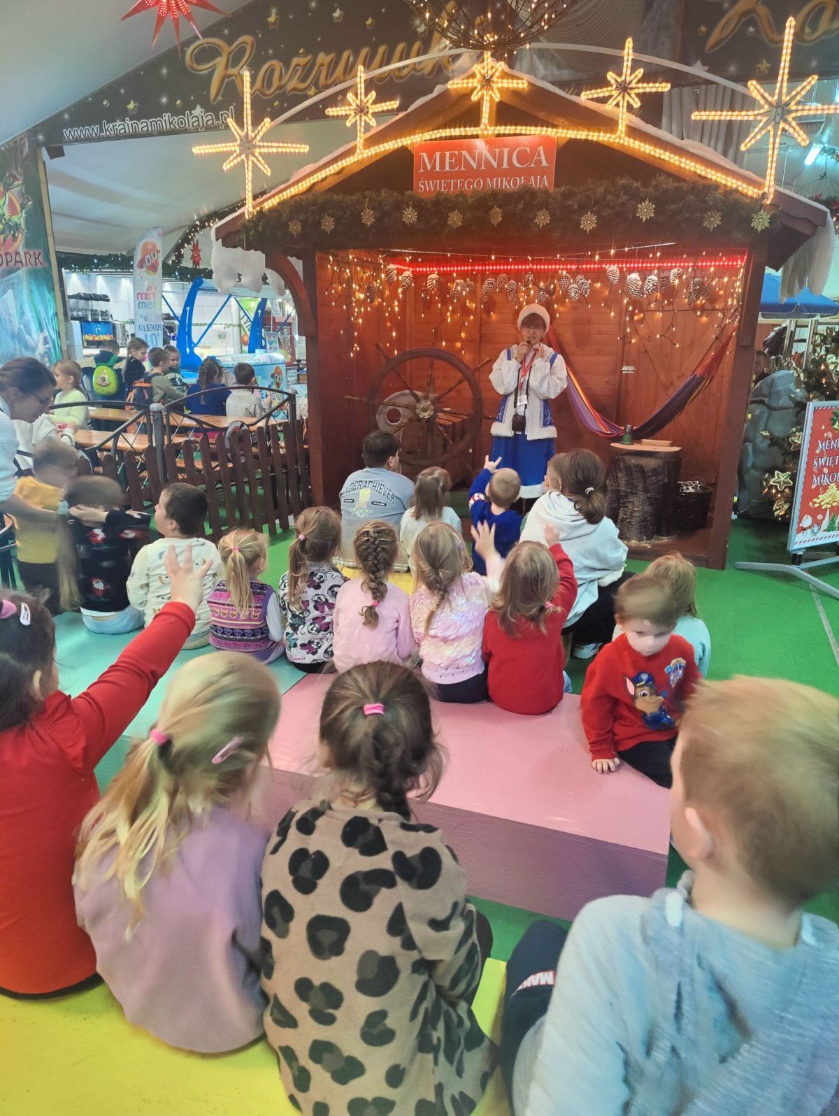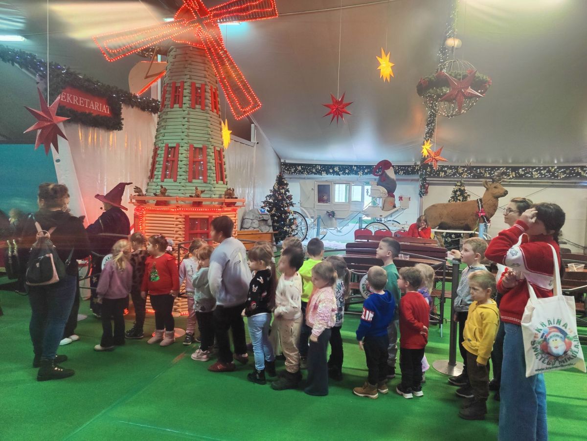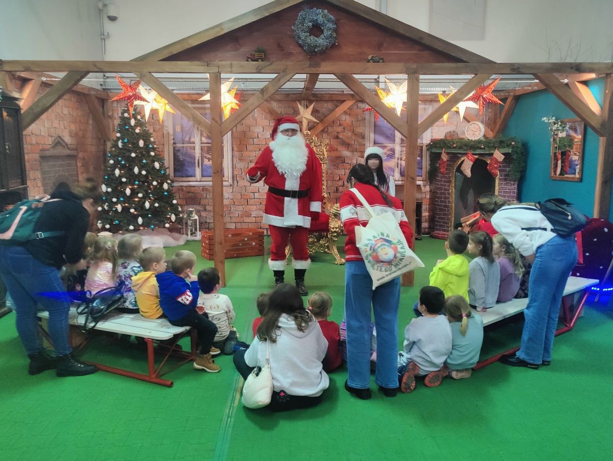 Kulminacyjnym punktem wyprawy było oczywiście osobiste spotkanie ze Świętym Mikołajem. Oczekiwanie w specjalnej sali tylko wzmagało emocje, a gdy wreszcie nadszedł ten moment, dzieci z dumą zaprezentowały swoje umiejętności, wspólnie śpiewając gospodarzowi kolędę. Mikołaj, wzruszony tak ciepłym przyjęciem, chętnie rozmawiał z przedszkolakami, a jego pomocnica – Mikołajka – zaprosiła wszystkich po odbiór zasłużonych prezentów z wielkiego worka.