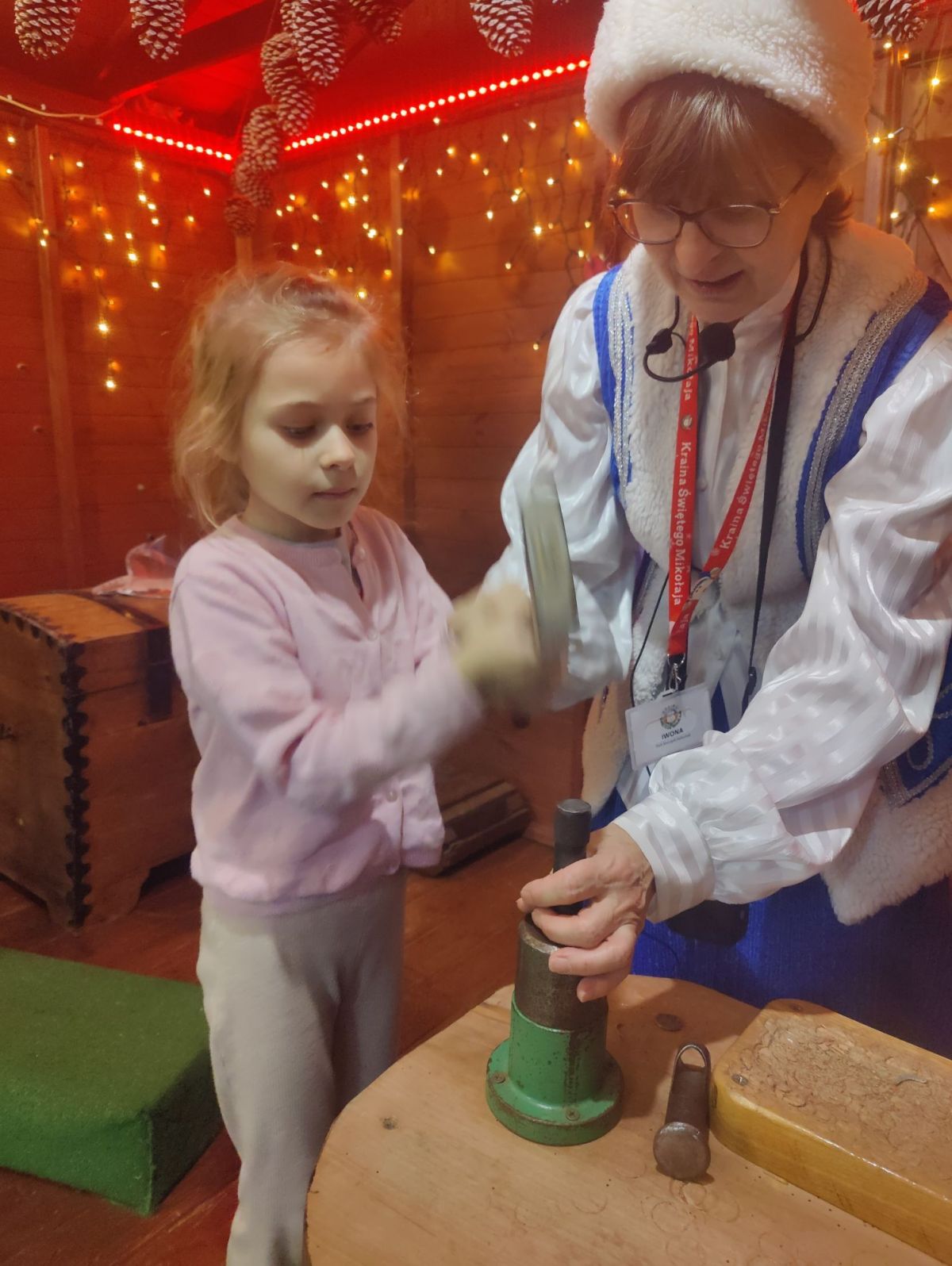 Wycieczka nie ograniczała się jednak tylko do oglądania wystaw. Nasi podopieczni mieli okazję aktywnie uczestniczyć w życiu wioski. Przy Mennicy Mikołaja dzieci poznawały sekrety powstawania świątecznych monet, a najdzielniejsi z wielkim zaangażowaniem pomagali Śnieżynce w jej codziennych obowiązkach w Mennicy.