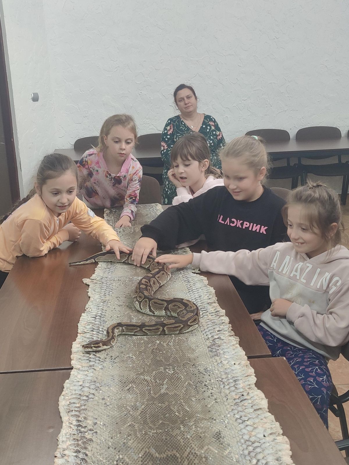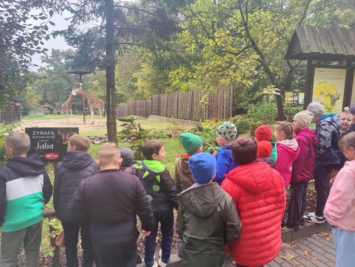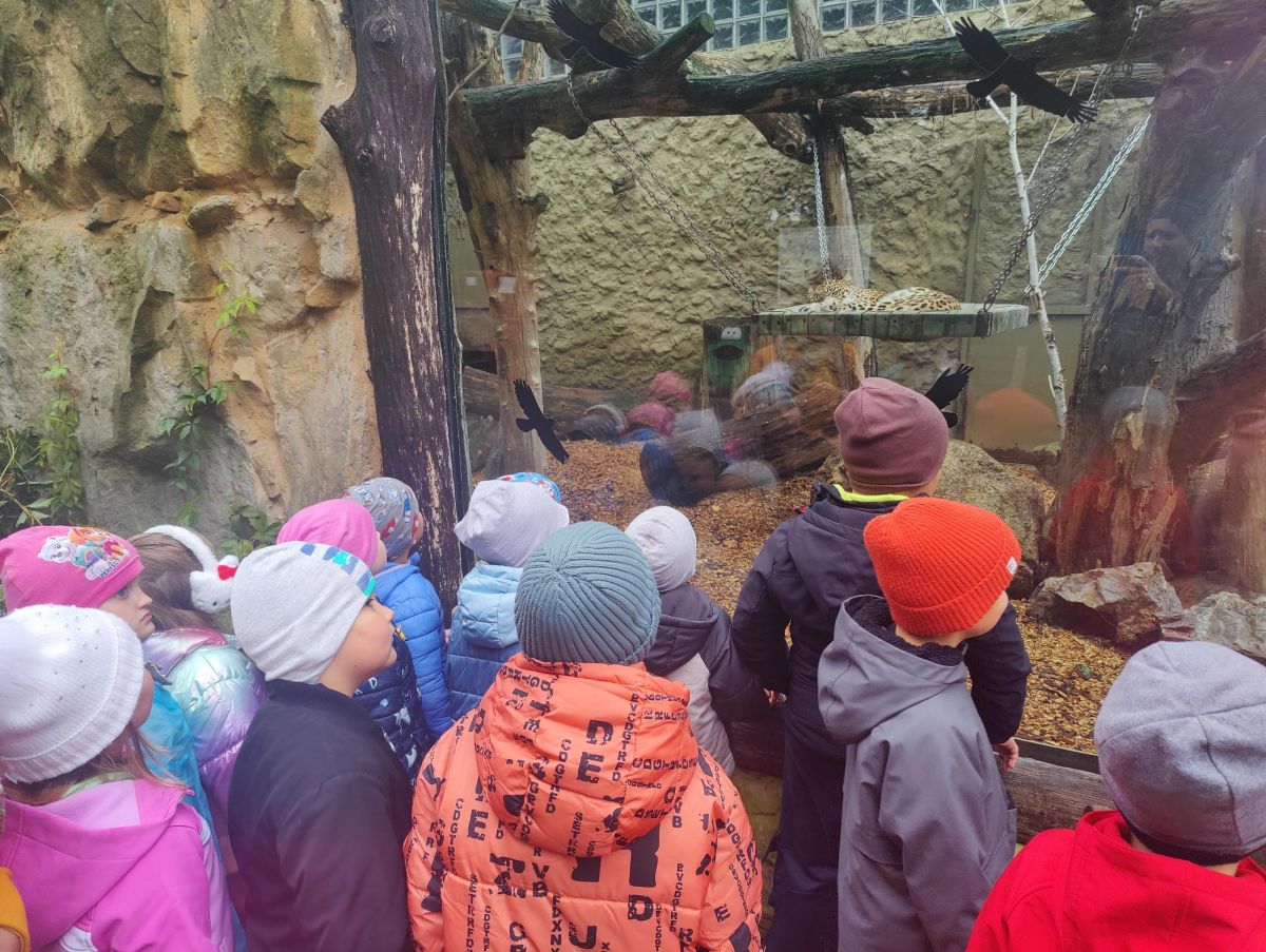 Pierwszym i głównym punktem naszej przygody był Miejski Ogród Zoologiczny w Płocku. Wizytę rozpoczęliśmy od zajęć dydaktycznych, podczas których uczniowie mieli wyjątkową okazję do bezpośredniego kontaktu z eksponatami przyrodniczymi. Dzieci z wielkim zainteresowaniem poznawały budowę i fakturę najeżek, pancerzy żółwi, skór węży czy futerek. Prawdziwą gwiazdą okazały się jednak żywy okazy: metrowy pyton królewski, którego najodważniejsi mogli nawet przez chwilę potrzymać czy zawiesić na szyi, oraz rzekotki i świnki morskie.
